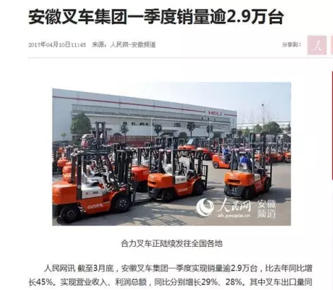 安徽叉車集團(tuán)一季度銷量逾2.9萬臺